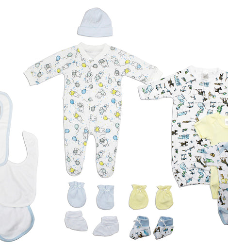 Unisex Print Gown (100% Cotton), Boys Baby Gift Set (100% Cotton), Yellow Short Sleeve Onezies (100% Cotton), Terry Sleep 'n Play (Small 0-3M) (80% Cotton / 20% Polyester Terry), Pink Baby Cap (100% Cotton), Yellow Baby Cap (100% Cotton), Pink Infant Mittens (Jersey), Yellow Infant Mittens (Jersey), White Booties (100% Cotton)