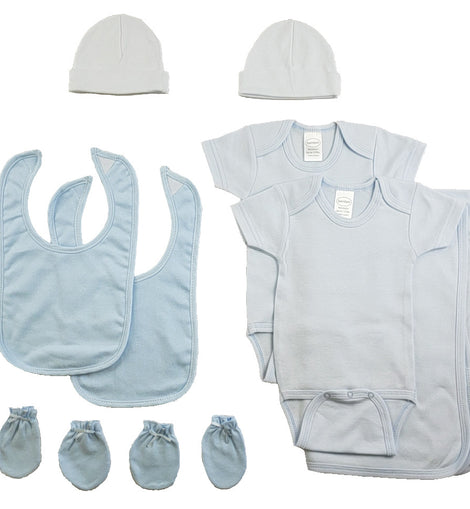 Blue Receiving Blanket (100% Cotton), Blue Interlock Short Sleeve Onezie (100% Cotton), Blue Interlock Short Sleeve Onezie (100% Cotton), Blue Baby Cap (100% Cotton), Blue Baby Cap (100% Cotton), Blue Infant Mittens (Jersey), Blue Infant Mittens (Jersey)